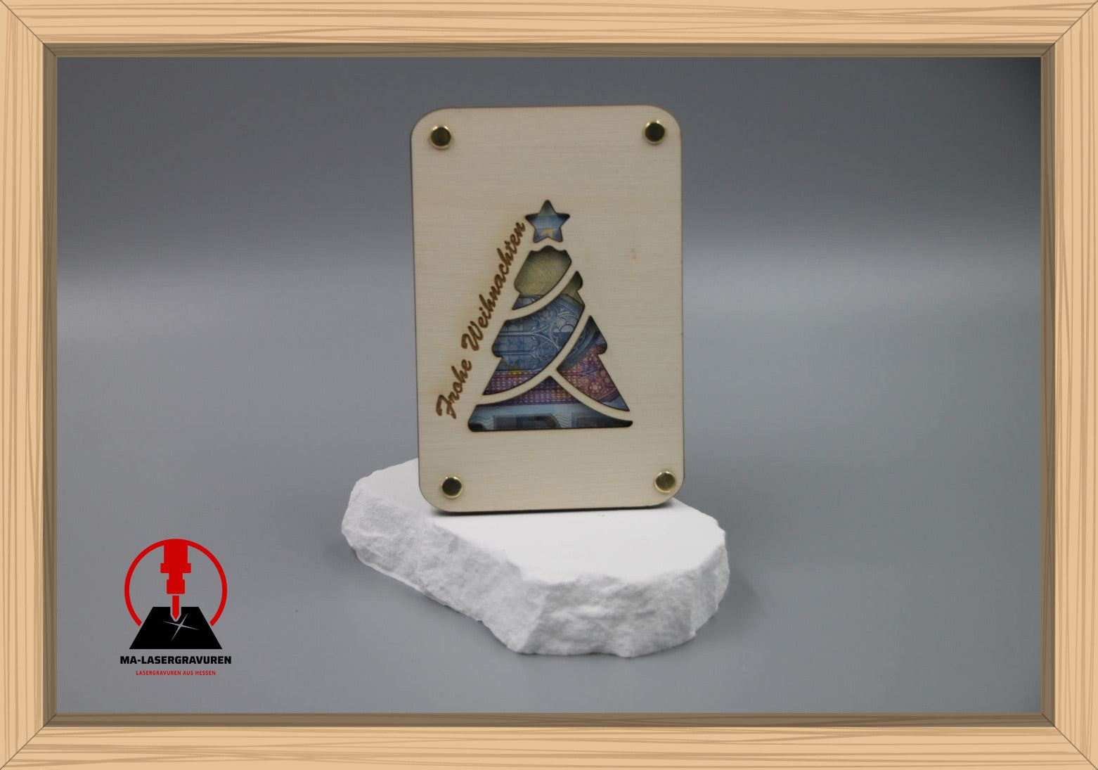 Zwei übereinander gebundene, gravierte und geschnittene Holzplatten halten Dein Geldgeschenk welches Du verschenken willst fest. Man kann durch die Ausschnitte erkennen welcher Geldschein sich im Inneren befindet.