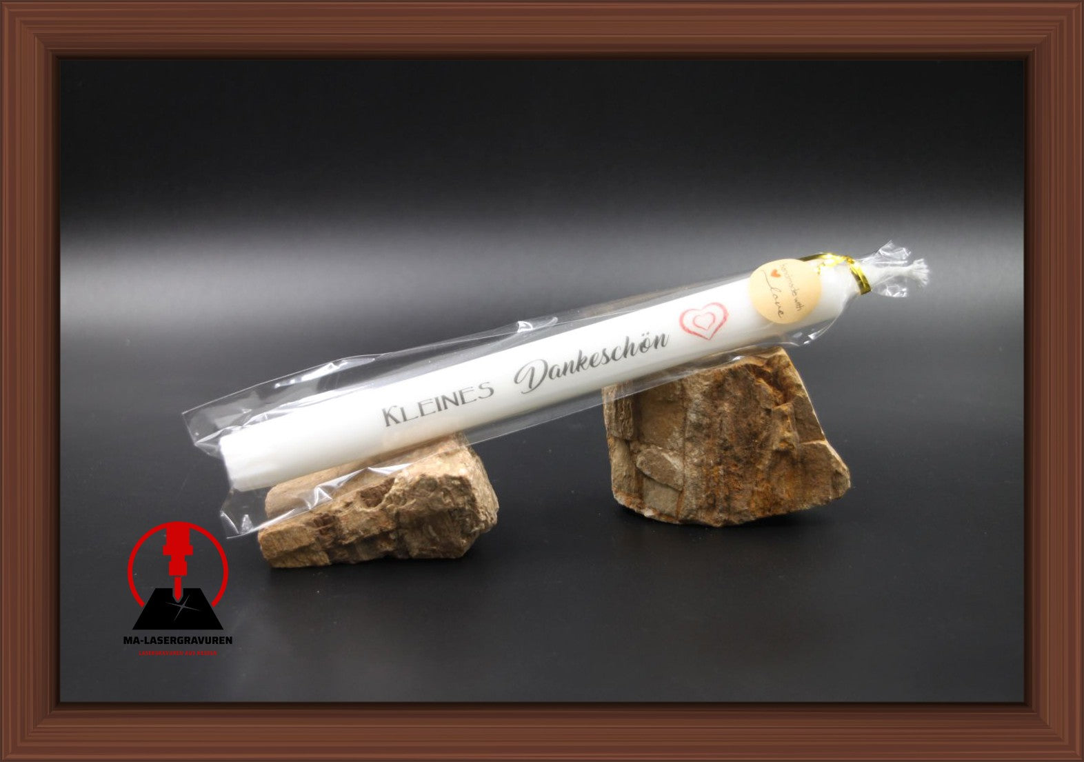 Die Beschriftung ist mittlels Laser auf eine Folie gebracht worden und dann auf die Kerze.