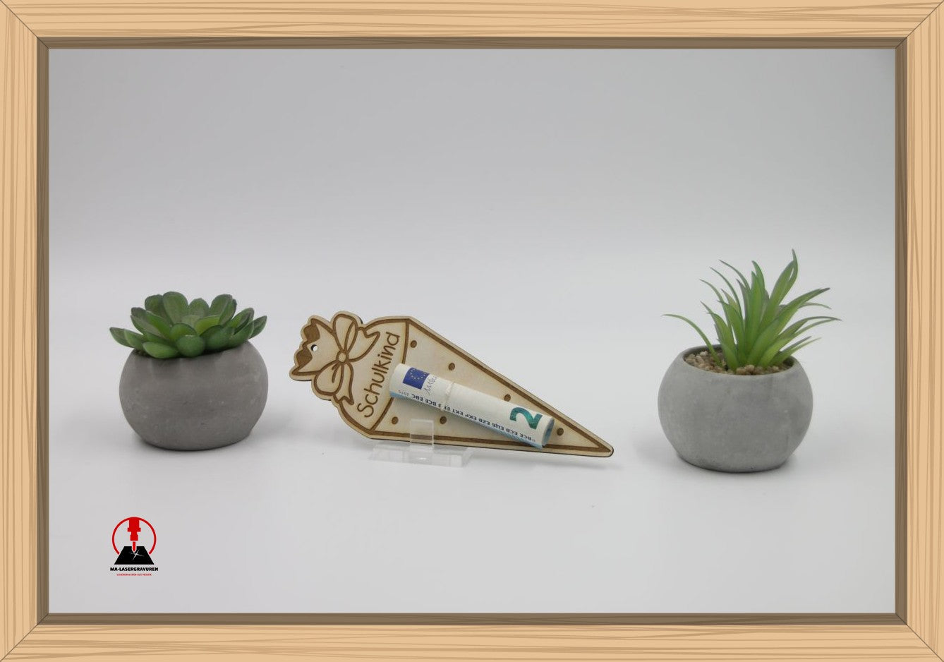 Ein kleines Geschen aus Holz mit der Aufschrift "Schulkind" um einfach nur eine kleine Freude zu machen. Ein Anhänger der einen Geldschein aufnehmen kann.