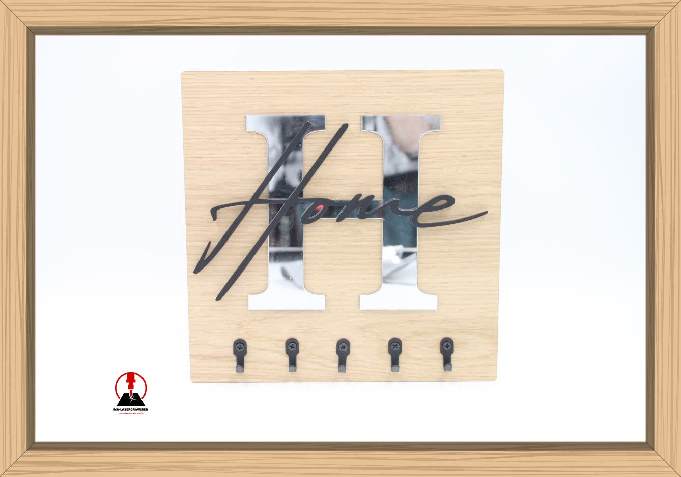 Schlüsselbrett aus Eiche Furnierholz mit 5 Haken für Schlüssel. Aufgesetzt ist ein "H" aus Spiegelacryl und der Schriftzug Home aus schwarzem Acryl.