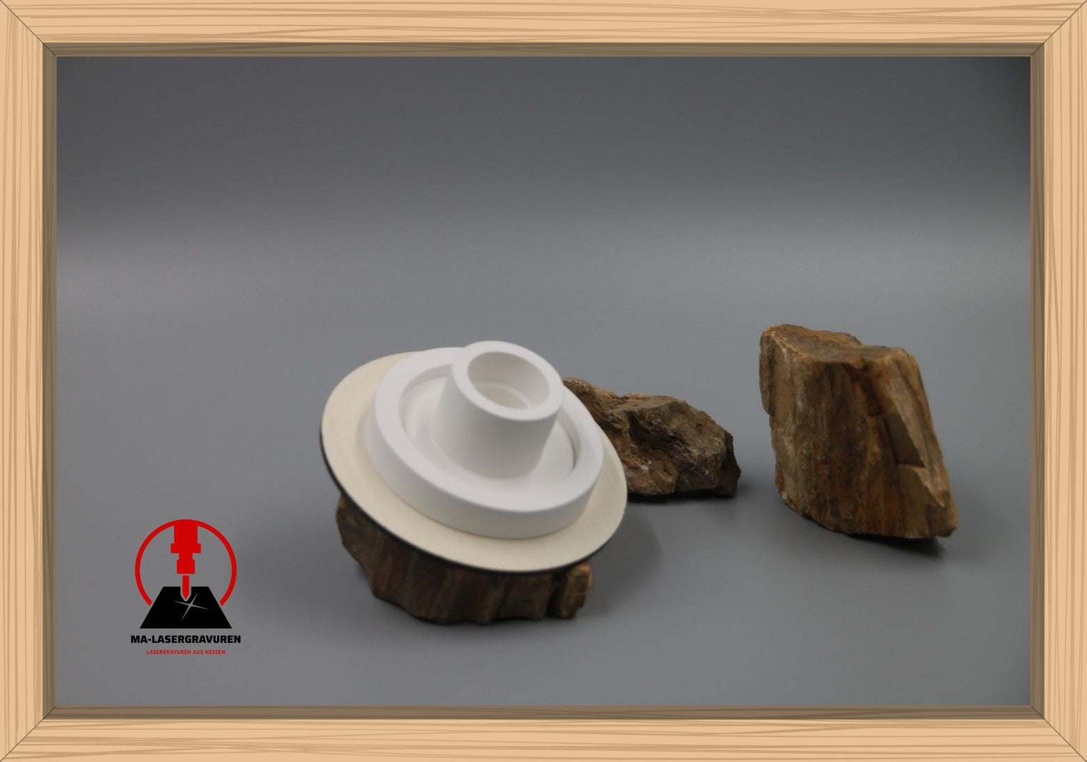 Stabkerze mit einem Durchmesser von 22mm und einem Halter aus Gießmasse in weiß mit einem Innendurchmesser von 22mm. Der Untersetzer kann in verschiedenen Varianten gewählt werden.