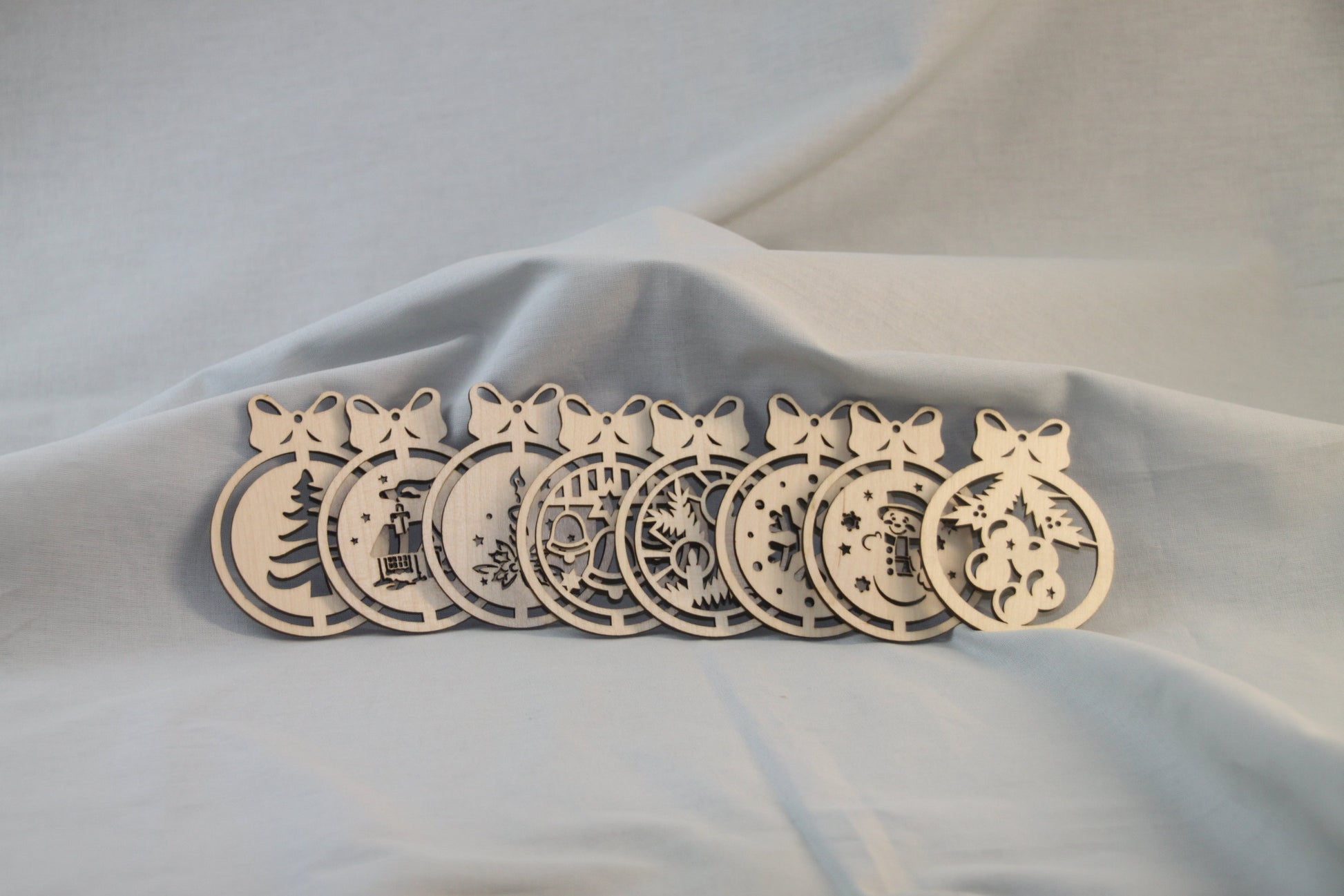Eine Box aus Holz mit acht Aufhängern, die unterschiedliche Motive haben für den Weihnachtsbaum. Ein schönes Geschenk.